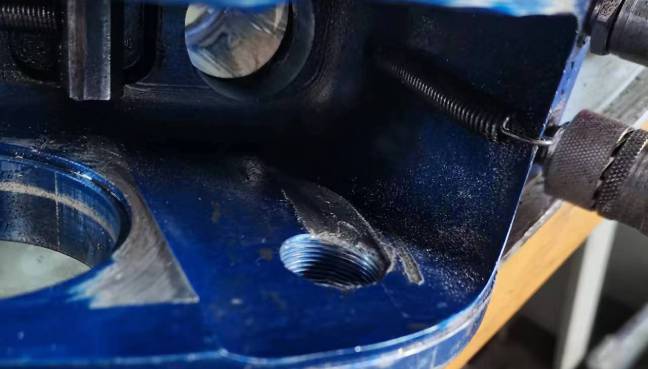 我們拆解檢查發(fā)現(xiàn),改扳手的兩側驅動板在同一位置發(fā)生斷裂,油缸外沿刮擦缺損嚴重,殼體內腔出現(xiàn)嚴重刮削凹痕,整個扳手內部充滿金屬碎屑。從各部位損傷跡象我們可以推導出最先出現(xiàn)問題的應該是驅動板。長期高負荷運行或者使用過程中的受力不均導致液壓扳手驅動板出現(xiàn)損傷,但彼時并沒有達到非常嚴重的斷裂,扳手有些微卡但依然能夠轉動使用,導致操作人員沒有及時發(fā)現(xiàn)和處理。但這個時候裂痕使得驅動板不再光滑,并與殼體及油缸外沿產生接觸和刮削嚴重損傷了油缸和殼體。同時,刮擦下來的金屬碎屑又在運動中進入棘輪棘爪,對棘輪棘爪也造成了不小傷害。本來只用更換驅動板,卻差點毀了整個扳手。