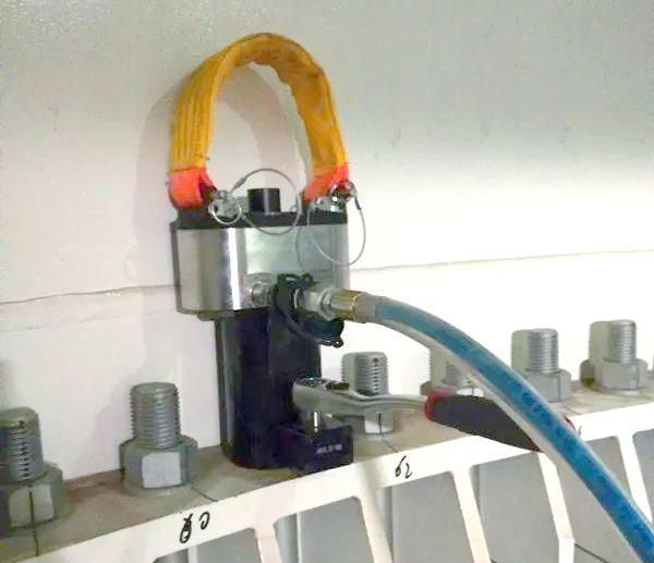 液壓拉伸器通過泵站壓力表實現(xiàn)精確的定值緊固,同步分流閥的設(shè)計使得一個泵站能同時驅(qū)動多個液壓拉伸器對多個螺栓進(jìn)行同步拉伸,從而確保所有螺栓同時達(dá)到預(yù)定的載荷值。