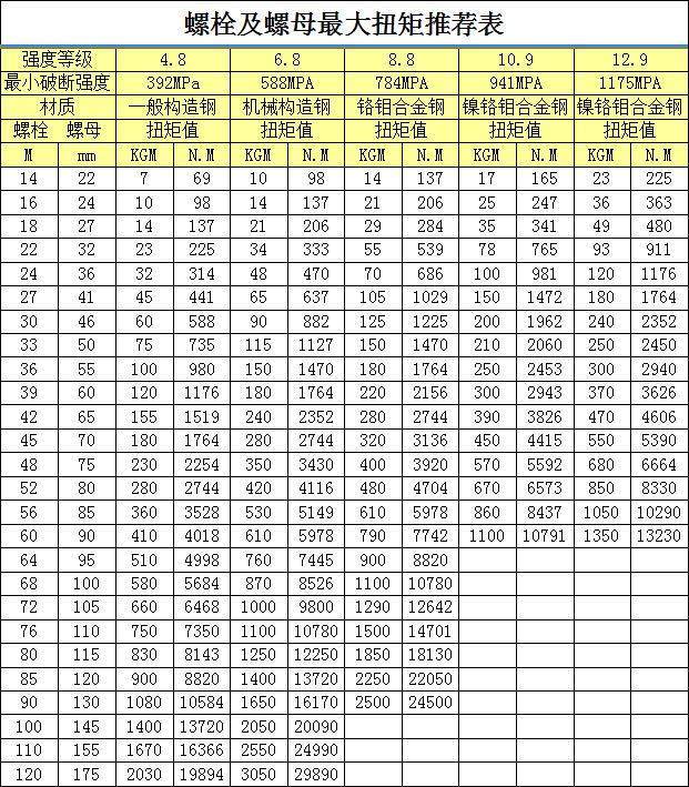 力矩?fù)Q算其實(shí)就是螺栓螺母扭矩值推薦表,通過這張表我們能夠查詢出螺栓螺母強(qiáng)度等級(jí)、材質(zhì)和螺栓大小扭矩值,通過這些數(shù)據(jù)我們也能更好的選型,知道自己的工況適合哪一種液壓扳手。其實(shí)如果你看不懂這張表,不知道中空式扳手力矩值換算怎么弄,也沒關(guān)系,畢竟現(xiàn)在很多液壓扳手品牌商家都會(huì)為你進(jìn)行售前選型。