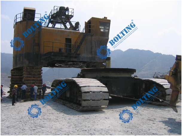 電鏟是千萬噸級露天礦山主要采掘設(shè)備之一,生產(chǎn)率高,作業(yè)率高,操作成本低,是目前采礦業(yè)公認(rèn)的機(jī)型。電鏟由行走裝置、回轉(zhuǎn)裝置、工作裝置、潤滑系統(tǒng)、供氣系統(tǒng)組成。鏟斗是電鏟的主要部件,它直接承受被挖掘礦石的作用力,因而磨損較大,斗桿也是電鏟挖掘過程中的主要部件之一,它的作用是連接和支持鏟斗,并將推壓作用傳送給鏟斗,鏟斗在推壓和提升力的共同作用下完成挖掘土壤的動(dòng)作;其行走機(jī)構(gòu)中最為核心的履帶裝置,經(jīng)過相關(guān)的傳動(dòng)機(jī)構(gòu)最終使其在地面直接移動(dòng)!